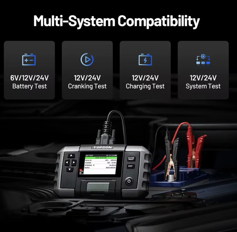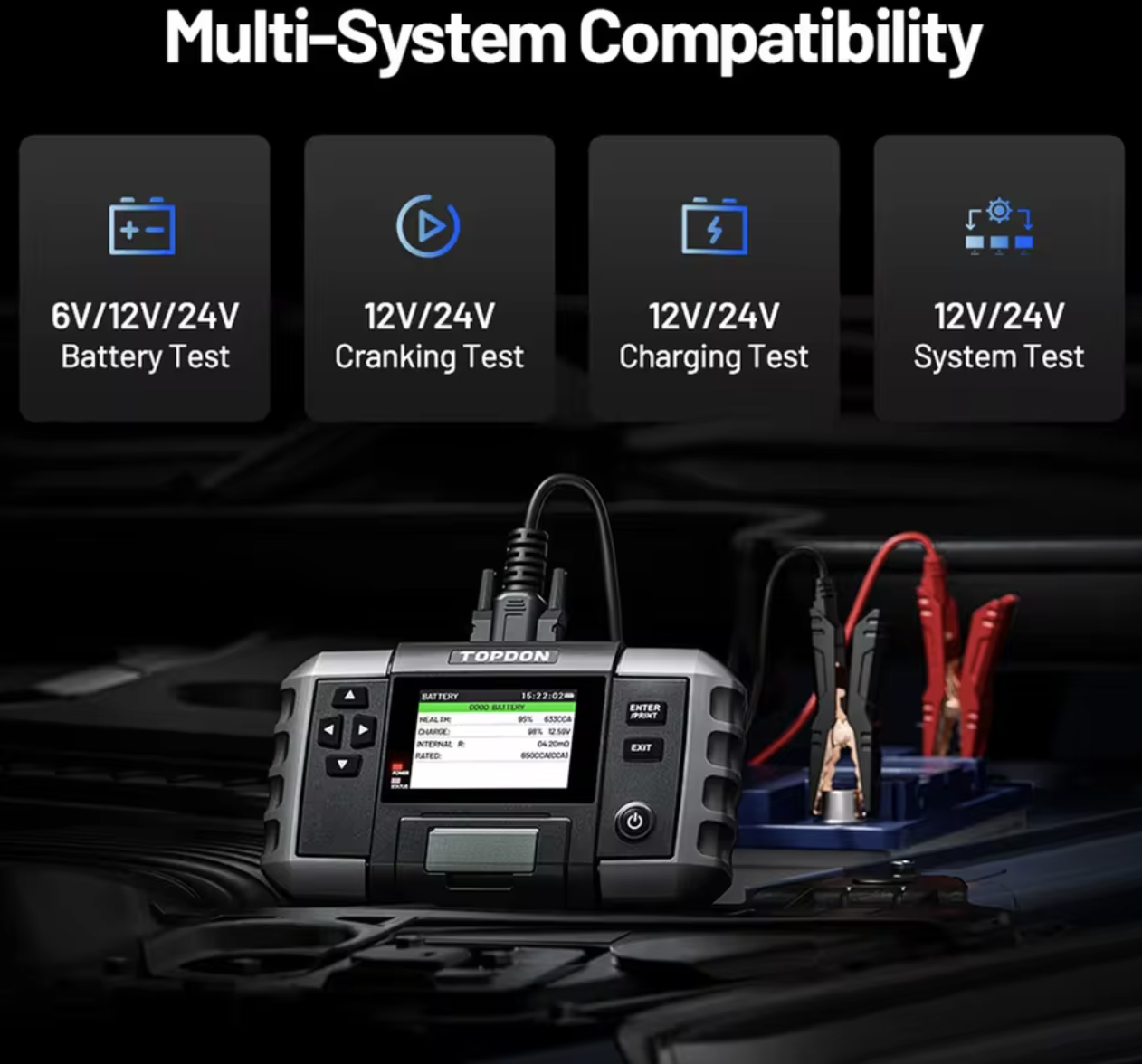 - Pruebas completas para baterías de plomo-ácido: Compatible con pruebas de batería, arranque, carga y sistema en sistemas de 6V, 12V y 24V.