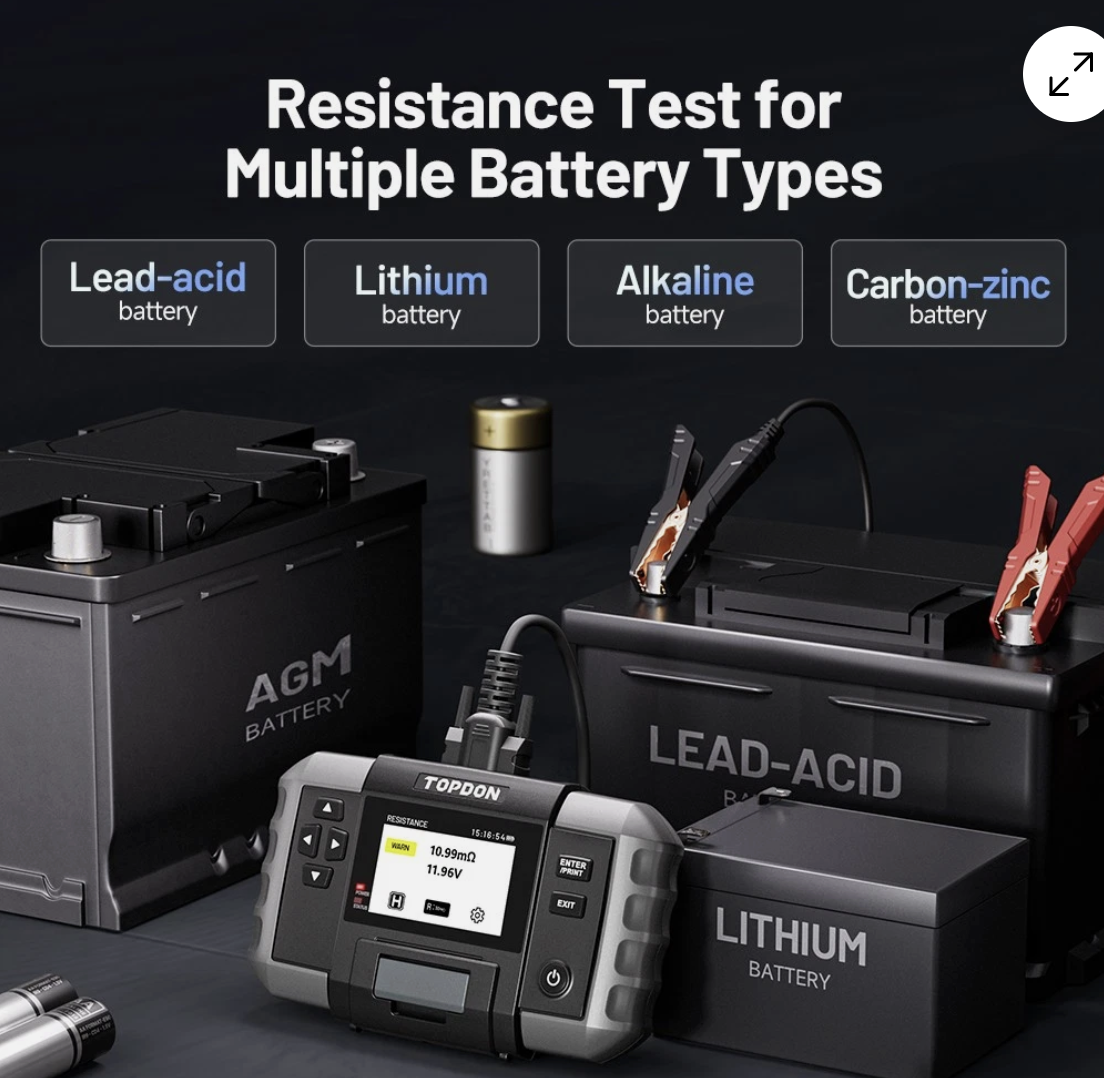 - Prueba de resistencia multi-tipo: Mide la resistencia en baterías de plomo-ácido, litio, alcalinas y zinccarbono.